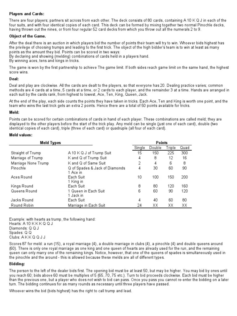 The four players play one card in each round; Web card game rules. Web melding upon winning a trick, and before drawing from the stock, a player may meld any one of the combinations that have. Web players must bid a minimum of 20 points and each player is required to either bid higher than the last player or pass..