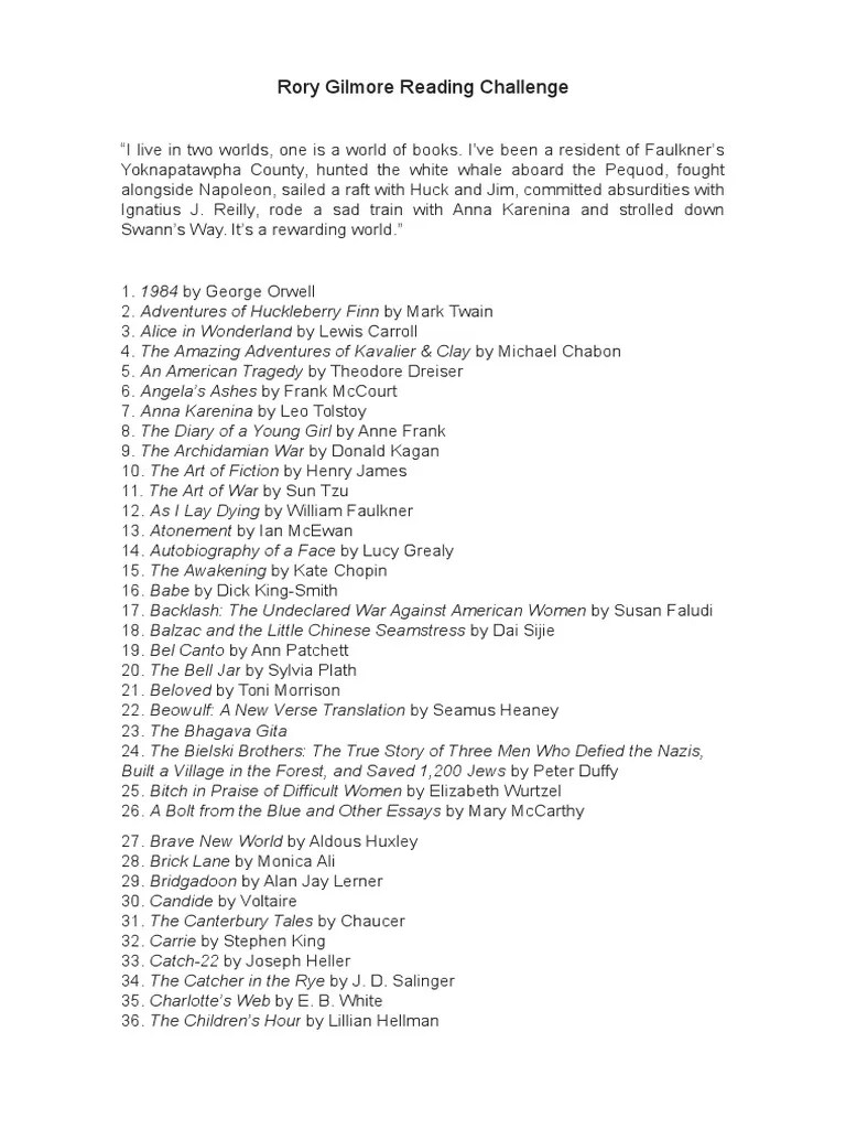 Here is a printable pdf of the. The awakening by kate chopin, the adventures of huckleberry finn by mark. Web rory gilmore’s reading list a comprehensive guide 1984 by george orwell adventures of huckleberry finn by mark twain adventures of tom. Web are you ready to tackle the rory gilmore reading challenge? Web check the whole rory gilmore book list.